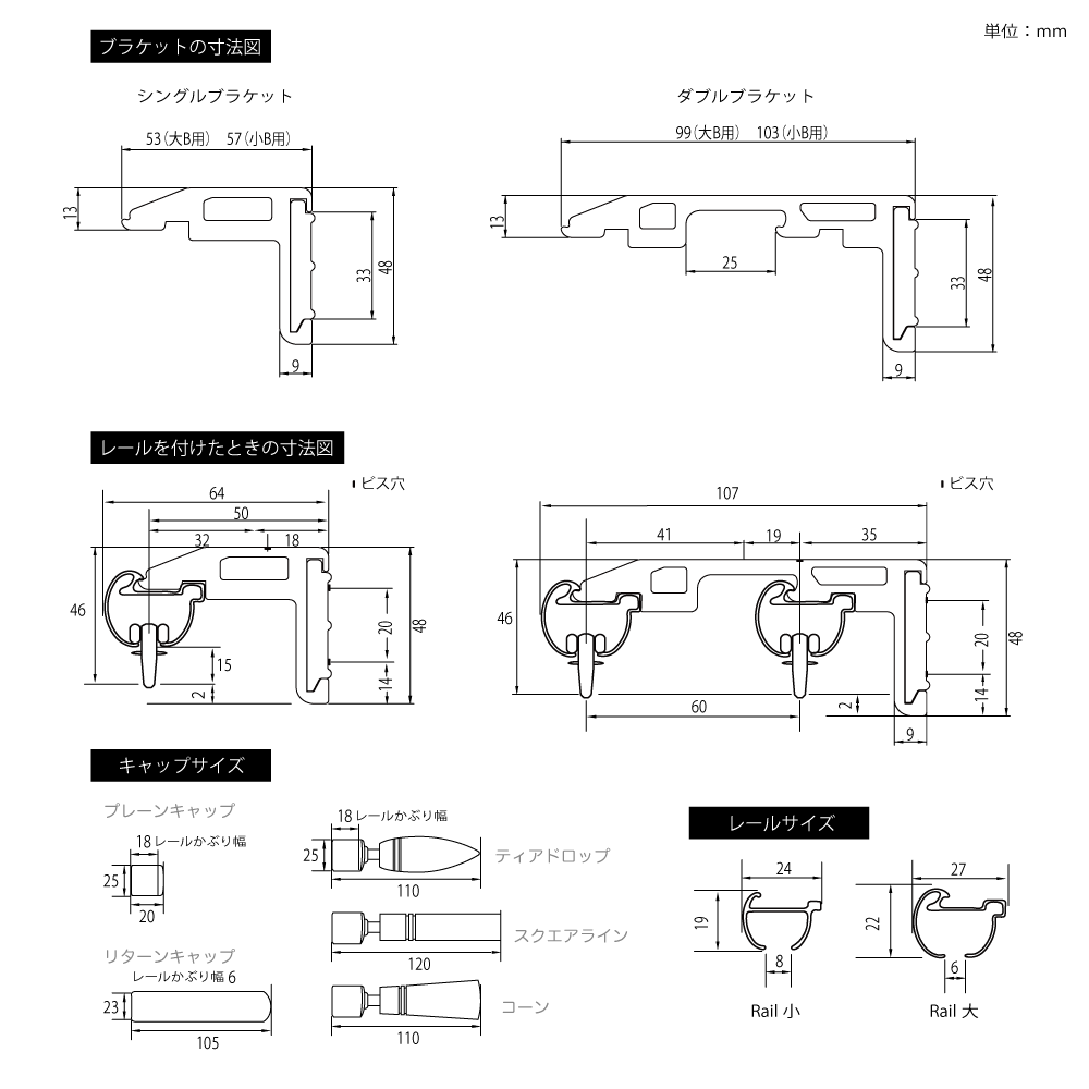 - 伸縮のレール、ブラケット、キャップにはサイズが大・小ございます。ご確認の上、お取り付けください。