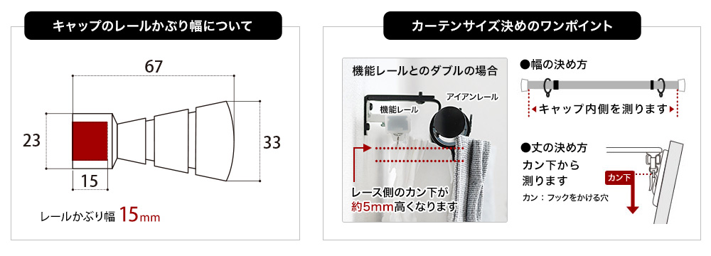 - 『ダブルセット』のレース側の機能レールの伸縮幅は0.7~1.2mサイズは0.6~1.0m、1.2~2.1mサイズは1.1~2.0mとなります。アイアンカーテンレールの伸縮幅と異なりますのでご注意ください。※付属の機能レールの長さが合わない場合は別途お問合せください。長さに合わせた機能レールをご案内いたします。