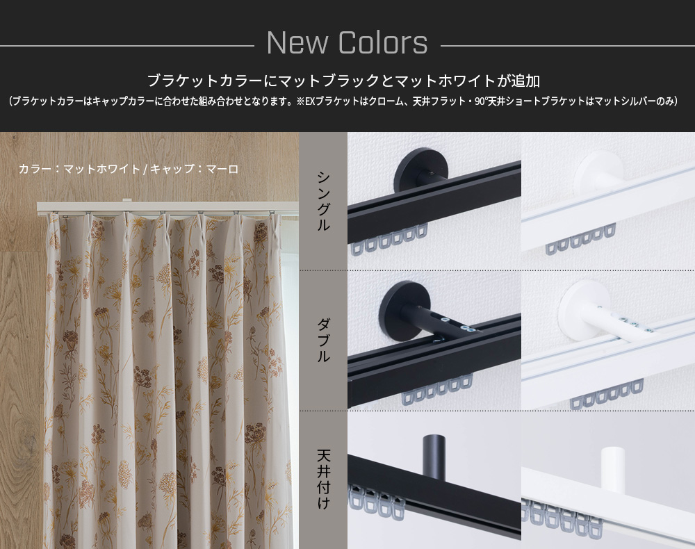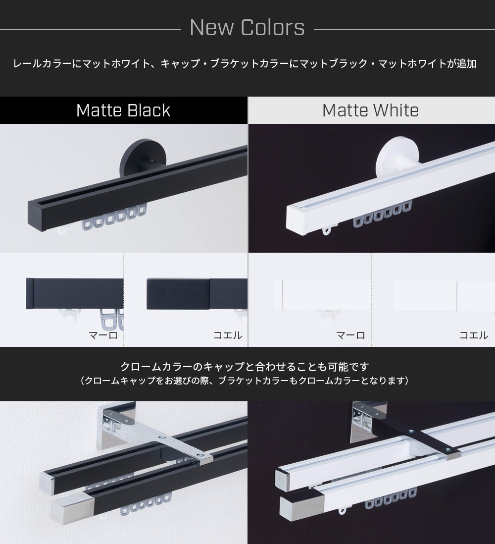 レールカラーはほんのりベージュがかったマットなサテンニッケルと、艶消しの黒がかっこいいブラックアイアン風なマットブラック、新しく加わったマットホワイトの3色。