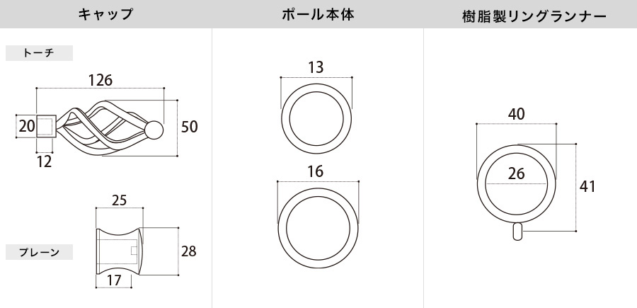 | 付属品 | 装飾キャップ・ポール(レール本体) 取付ブラケット・取付用ビス(ネジ径4mm/ネジ下32mm) 樹脂製リングランナー |